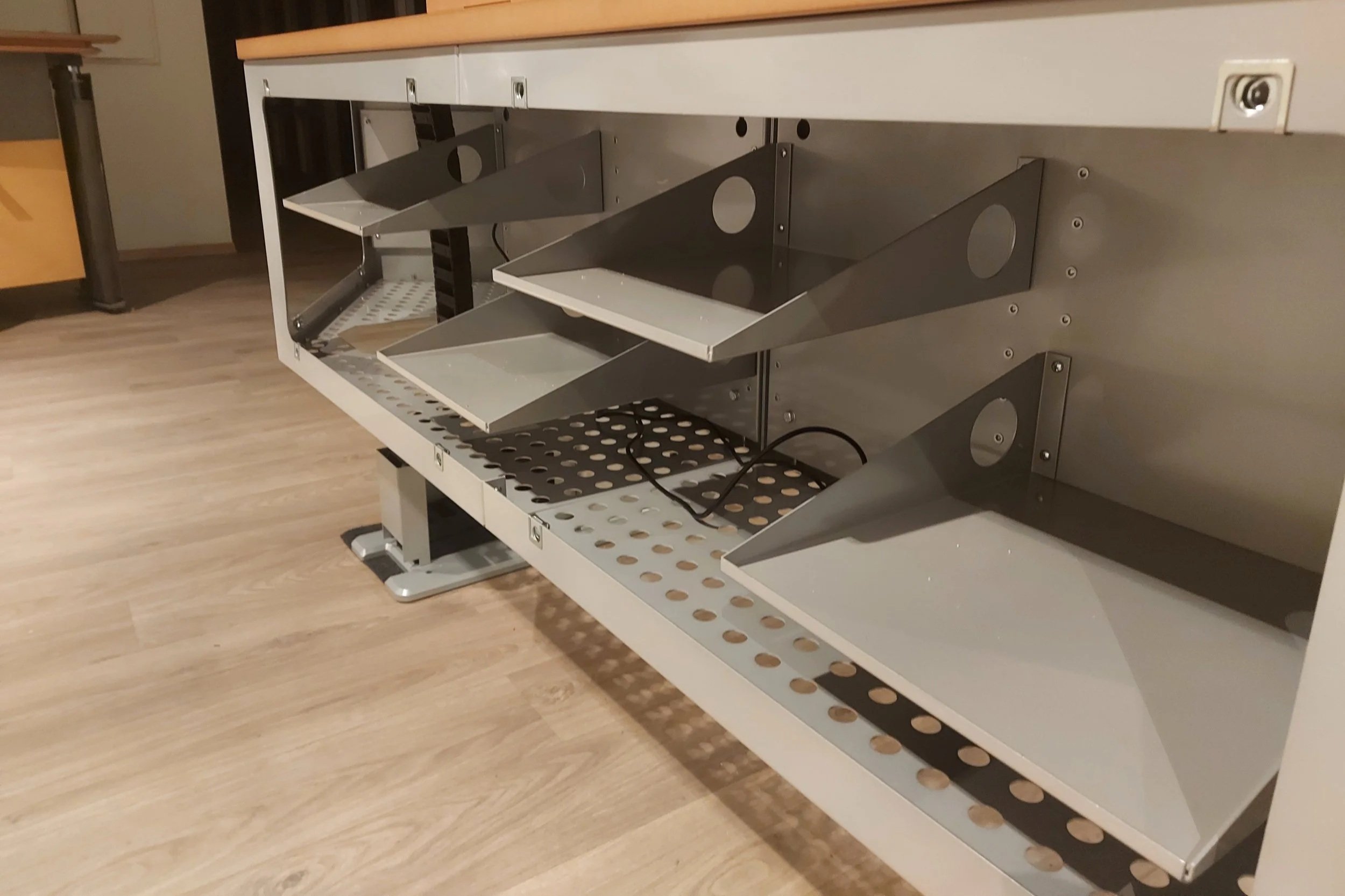 Skjermhyllen har integrert spor for montering av skjermholdere. Dette gir stor fleksibilitet for plassering, flytting og oppgradering av skjermoppsett uten omfattende ombygging.